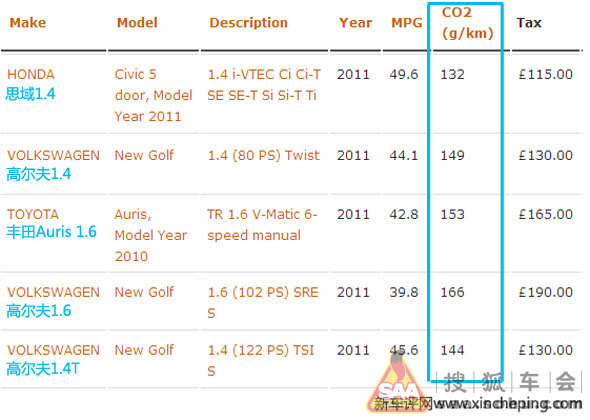 我这里有一个网站:http://www.car-emissions.com,里头可以查到欧洲市场出售的各款车型(具体到发动机和变速箱形式)的油耗和二氧化碳排放量。之所以有这么详细的二氧化碳数据,是因为他们要征收二氧化碳排放税。我选了两组同档次德、日系车进行二氧化碳排放值比较,包括1.6自然吸气对比——丰田Auris(欧版卡罗拉两厢)1.6对大众Golf 1.6;1.4L自然吸气对比——本田Civic 1.4对Golf 1.4(因为Auris没有1.4L排量,Civic没有1.6L排量,所以用了两个不同车型,不过它们都算是日系车的标杆);这两者我们再加入大众Golf 1.2TSI和1.4TSI分别与之对比。然后升高一级,用欧版雅阁2.0、2.4对大众帕萨特2.0,再看看新帕萨特1.8TSI和2.0TSI的表现。