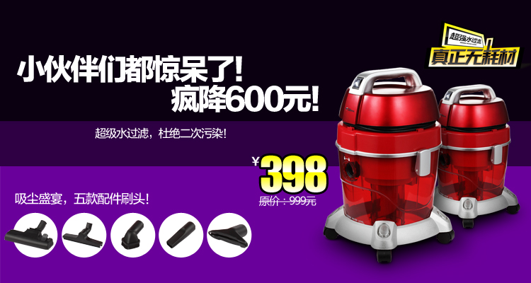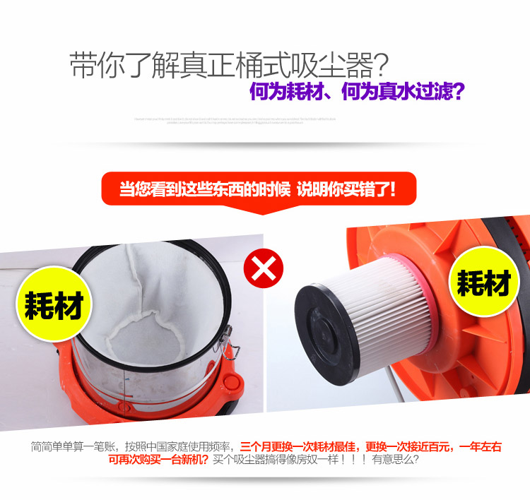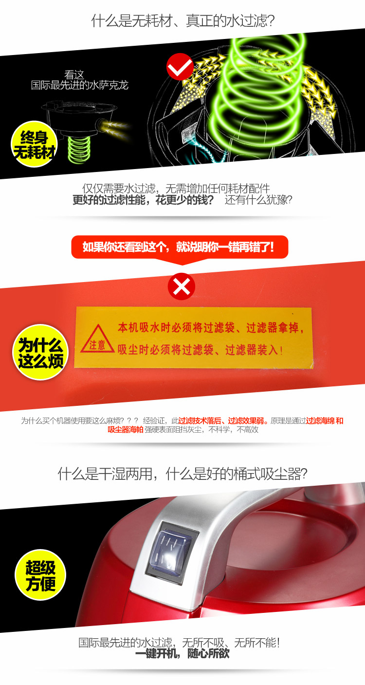 4. 电源线够长,颜色亮不足: 塑料配件质量超级差,第一次用就破裂了。而且完全不吸尘。心得: 听了朋友的推荐给公司买了这款吸尘器,郁闷死。噪音还算可以忍受,可真的对不住吸尘这两个字,连纸屑都吸不起来。除了颜色还蛮好看和电源线够长之外,真的找不到其他优点。还有塑料扫把头的质量真的差的离谱,第一次使用就破裂了。这是我第一次买杂牌电器,终于知道了什么是品牌的力量。