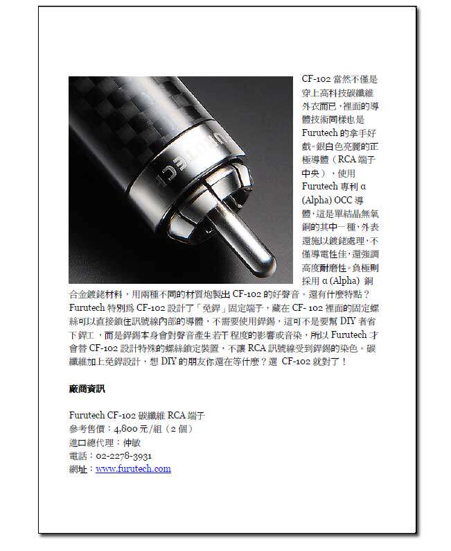 焦点.虽然Furutech将e-TP60定位为接续PRO.28N的产品,但它的细节、背景宁静度、声音的纯度、速度与冲击感等各方面表现,比起PRO.28N更为精进,是无法负担RTP-6者的最佳选择。