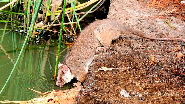 (图为一只负鼠在植物园的水塘里喝水解渴)