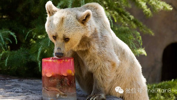 (图为动物园一只叙利亚棕熊在酷暑天气享用为它特制的冰糕。冰糕包含了蔬菜、水果、肉,还有草莓做topping。。看起来好好吃哦,弱弱地说一句:小编也想吃这玩意儿)
