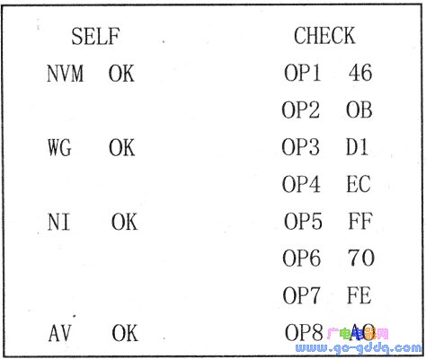 同时按下遥控器上的“定时关机”键和电视机前面板下面控制盒内的“音量减小”键,这时屏幕自动转换为4:3状态,且画面无彩色、无图像,呈轻微雪花状态,并显示如下内容。若再按任一键或断电,则自动清除自检功能。左边显示的内容是受控IC检查结果:NVM为存储器,WG为德国立体声,NI为丽音解码器,AV为AV开关。OK为正常,NG为不正常。不正常时检修该IC及周围相应电路。右边显示的内容是电路工况设置的16进制选项码,范围为OO—FF。