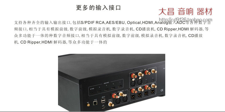8. 更多DAC输入接口同轴RCA* 4组 AES/EBU* 2组 光纤Optical* 2组