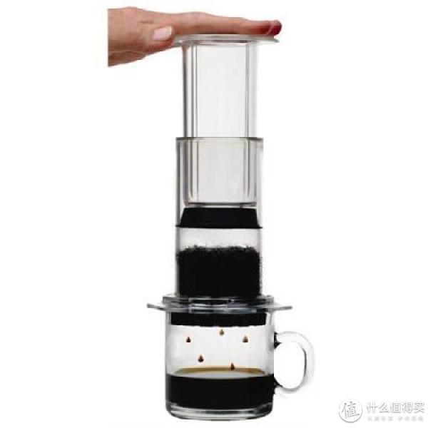 原理:与传统法压壶不同之处在把咖啡粉装在最低下的滤网中,用类似注射器的原理把水推下去穿过滤网中的咖啡粉。 优点:压力比传统法压壶大,浓度较高,不易损坏,易清洗 缺点:小贵,¥230+