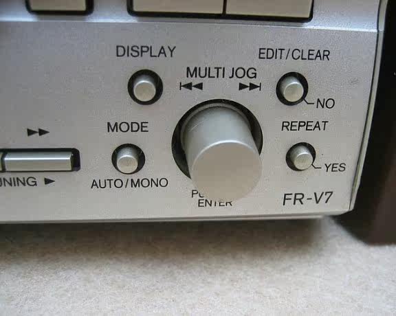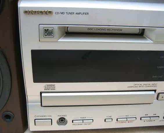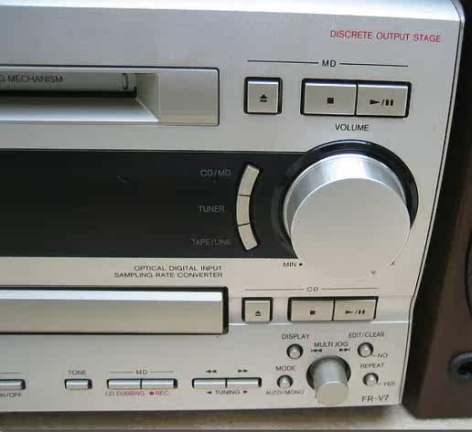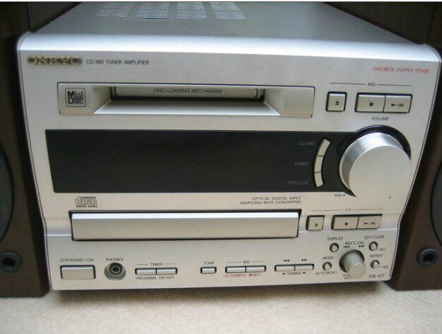 成色非常不错的ONKYO安桥 FR-V7组合音响。CD/MD/收音三合一组合,音质非常不错。安桥FR-V7用的是SONY213光头,不用担心长时间使用以后光头更换的问题!收音FM为76.0-108.MHz波段。适合中国使用~带光纤输入,其资料网上有很多介绍,我 日本产,电压110伏, 输出级电路用分立元件组成 个性调节高低音声音模式 超重低音输出 MD录音/播放机特性 先进的数/模、模/模转换器 内置的采样率转换器 数码录音电平调节功能 信号同步录音 指定乐段的转录 2种录音模式(单声道/SP(标准) 5种编辑模式(合并/分割/移动/擦除/名字输入)方便的标题输入 25乐段编程 4种播放模式(乐段/全部/随机/记忆) 2种重复模式(重复/连接) CD播放机特性 数码录音电平调节功能 CD至MD的同步录音 CD至MD的模拟录音 碟片标题输入 25乐段编程 4种播放模式(乐段/全部/随机/记忆) 2种重复模式(重复/连接) 可播放CD-R 调谐器及其它特性 数码输入(光纤) 数码输出(光纤) 5种定时模式(工作日/周末/一次/录音/睡眠) 可预设30个FM/AM电台 FM频段自动搜索调谐 马达驱动的音量控制 静音(用遥控器操作) 不需要电池的后备记忆 耳机插口