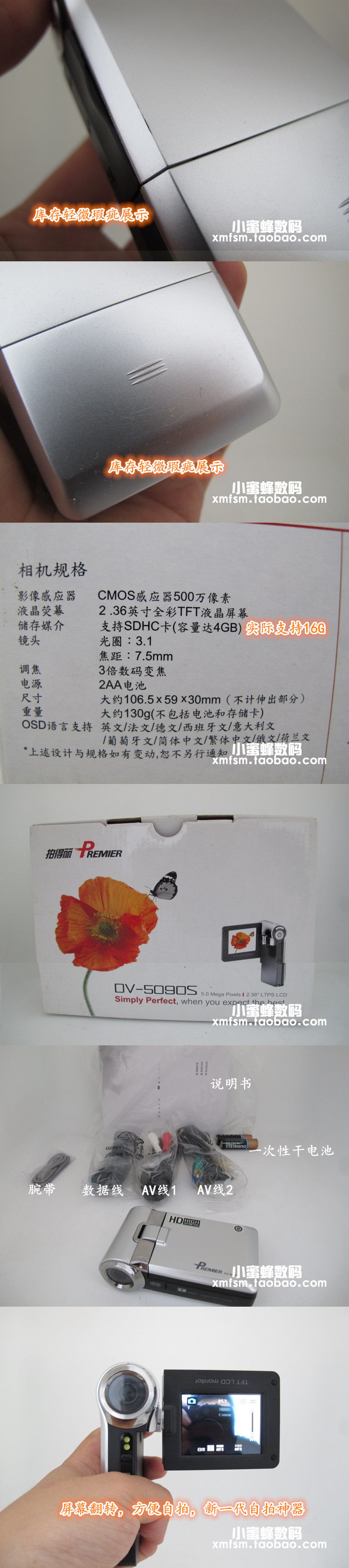 新到一千台厂家库存 正品台湾拍得丽Premier DV-5090S数码dv录像机/摄像机拍照,录音一体机。此机器性价比超高,绝非2手机,翻新机器,带盒子包装全套配件,但是因为库存了几年,运输,仓储等原因,机器稍微有零星的瑕疵,所以便宜卖,绝对没有人用过库存货。此款正品台湾拍得丽Premier DV-5090S数码dv录像机/摄像机拍照,录音一体机效果非常好,采用500万硬件cmos芯片,可以拍摄1280x720P高清录像,800万像素照片。效果非常好秒杀千元级别DV因为是手持DV录像机摄像机,所以拍照功能稍显薄弱,但是录像很清晰,199元也就是行车记录仪的价格,但是效果是千元DV的效果,秒杀行车记录仪几条街,正规厂家品牌秒杀所有山寨货。 正规DV摄像机录像机不带闪光灯,有两颗LED补光灯