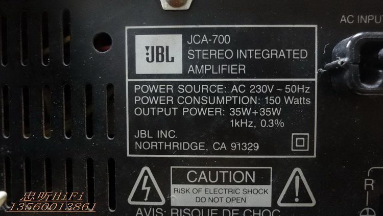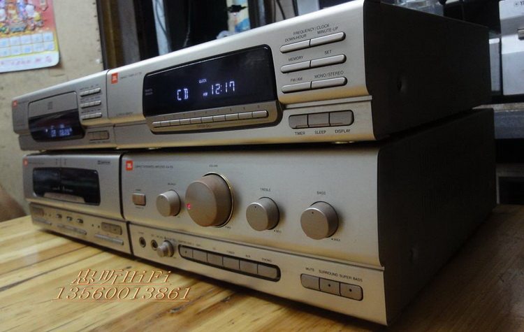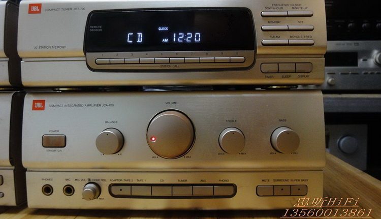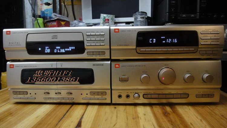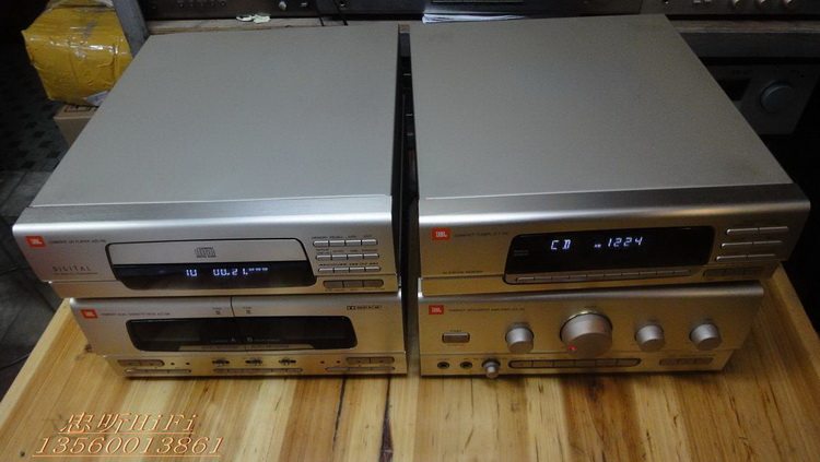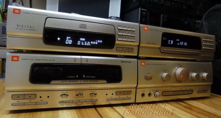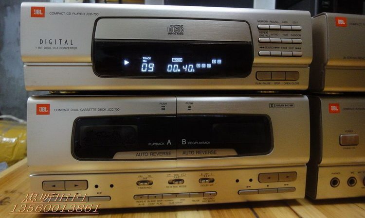 原装美国正品JBL JCA-700 高档组合主机头 JBL50周年纪念版原装230V欧版.CD+收音+功放+卡座.四件装.无维修过.内部用料足.CD机:JCD700.分析能力好读碟能力强.翻版碟刻录碟通杀.够稳定.收音机:JCT700.FM-AM波段.FM87-108国频.自动搜索调谐.接收能力强.灵敏度高.立体音输出.卡座:JCC700.AB双卡.A卡只管播放.B卡能播能录。自动反唱。功能全正常。功放:JCA-700.电力消耗150W.输出功率35W+35W.1kHz,0.3%.1级低音模式,独立高低音左右声音平衡调节。输出级电路用分立元件组成.有隔离的重型电源变压器.马达驱动的音量控制.3组音频输入.可接电脑.手机.DVD等音频输入当功放使用.铝合金的前面板.RI红外线遥控器接收.信噪比:100dB. 尺寸:CD.宽27.高8.5.深30. cm. 收音.宽27.高8.5.深30.cm 卡座.宽27.高11.5.深30. cm. 功放.宽27.高11.5.深30.cm 实物图: