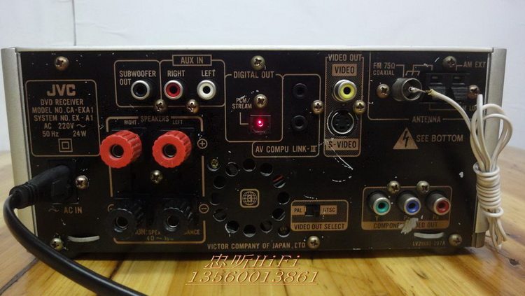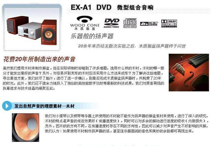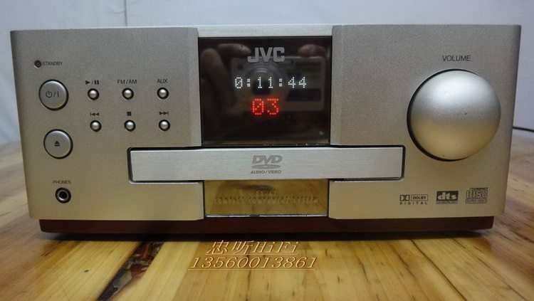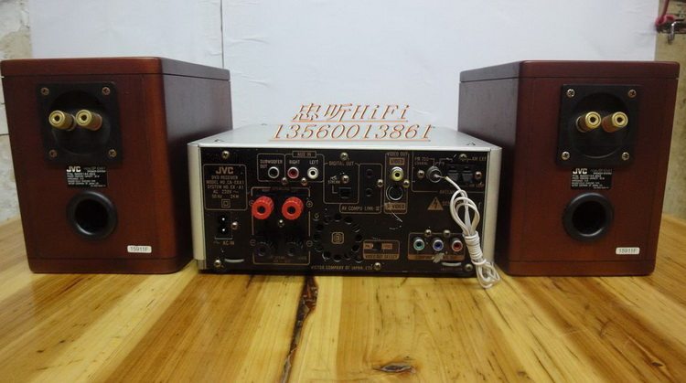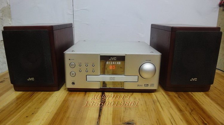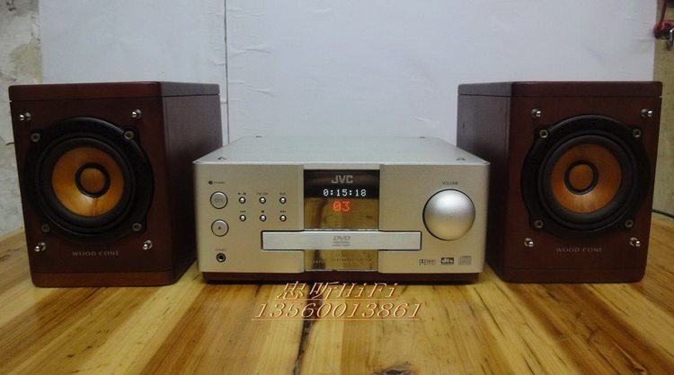 原装正货.集合CD.DVD影院和听音乐一体化.原装220V电压.外观高档.整个机身都是采用合金构造成的.功放采用数字放大.功能全正常.无维修过.无遥控器需要自配.机子读碟能力强.正版盗版DVD.CD通杀.带收音AM-FM.FM87.5Mhz---108Mhz中国制式.灵敏度高.接收能力强.后面还有一组AUX外接音频输入可接电脑.手机等播放器.当桌面功放使用也非常不错.搭配的音箱是JVC公司花费20年制造出来的.也是世界首创的Wood Cone Speaker (桦木振盆).天然樱桃木材质音箱.镀金香蕉头接口.铝制双弓形面板构造.喇叭单元纯桦木振盆全频.8cm.低音反射式.阻抗 4 ohms.喇叭全正常.无维修过.音箱两侧有少少磨损。整体都很好.听CD音乐声音通透音质分析力非常的好.看DVD影院大动态表现也很满意.外形尺寸采用了紧凑型的设计.比较精致微型.为卧室和书房的首选.总体表现相当出色.音色不同凡响值得拥有.