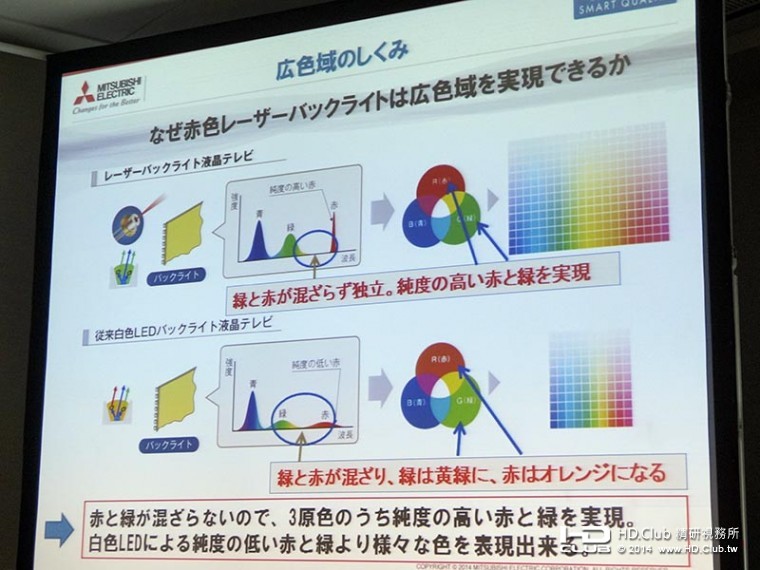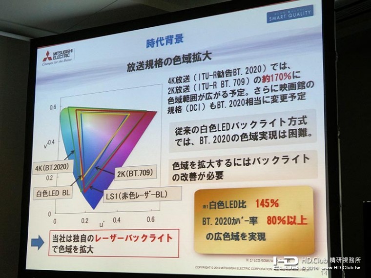 4K不管是广播放送或未来的4KBD,色域规范都将迎接是传统BT.709 170%的BT.2020色域。三菱有鑑于传统液晶电视的白白色LED背光已经无法跟上BT.2020的超广色域,因此决定开发雷射光源搭配青绿色LED背光技术。