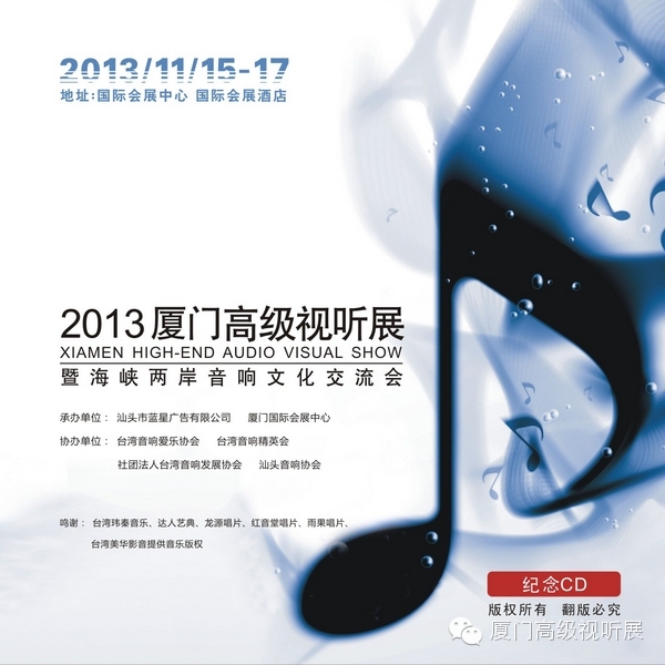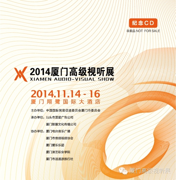 活动主题:微信互动送展会纪念CD! 活动时间:2014年11月5日-11月13日 活动流程: 1.关注厦门高级视听展微信公众号。(公众号:xmavshow)「已关注的朋友忽略此步骤」 2.转发本条活动信息至朋友圈。 3.将转发的朋友圈截图及姓名、手机号码以聊天方式发送至本公众号。 4.每天前50名完成以上步骤即送纪念CD一张,每天第51名起的朋友即送参观门票一张,并享有8折优惠价购买纪念CD的特权。 5.符合参与规则的粉丝除了获赠门票,更有机会参加每天纪念CD大抽奖。