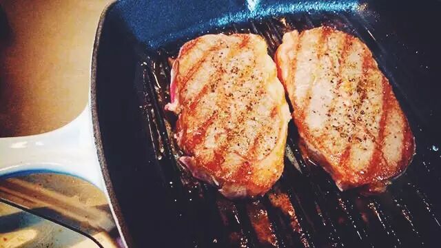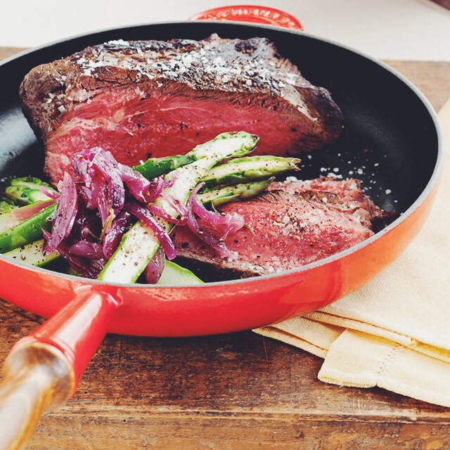 ③珐琅铸铁牛排锅 Enameled Cast Iron Grill Pan - 适合煎牛排羊排之类比较难熟的肉排,煎三文鱼就完全没必要了。煎牛排的话,锅身经过充分预热,瞬间高温可以让牛排外部很快被煎熟,锁住内部汁水。锅底有平滑和条纹之分。锅底平滑的珐琅铸铁煎锅适合煎一些小肉片或者荷包蛋。条纹锅适合煎肉排,肉排和锅之间有间隙,比较容易翻面,煎出来的牛排还有漂亮的花纹。