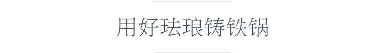 清洗保养 - 为了让珐琅铸铁锅更好用,需要在使用前开锅。操作起来很简单:在锅内壁和外壁均匀地涂上植物油,在燃气上把油脂烘干,锅表面会有一层薄薄的油脂,保护锅具的同时,也更不容易粘锅。珐琅铸铁锅很容易清洗。先用温水浸泡,倒掉水后用百洁布轻轻擦拭就行,不要使用洗洁精。表面有烧焦痕迹的话,可以试试「QUICKLEEN」的洗锅粉。