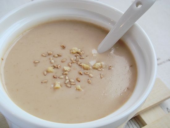 5.芝麻蜂蜜豆浆 用料:黄豆,黑芝麻,蜂蜜40克,水 制作:将黑芝麻与浸泡过的黄豆入入豆浆机杯,开动豆浆机自动完成 归经:入脾、肺 功效:养颜润肤、乌发养发