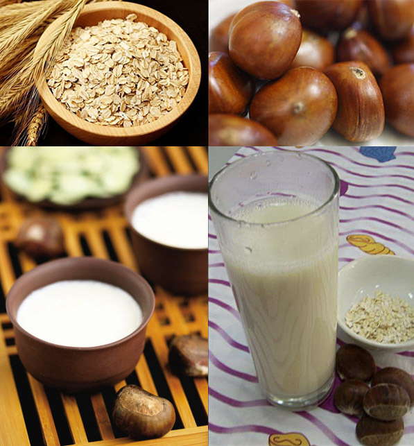 2.栗子燕麦豆浆 材料:干豆40克(湿豆90克,湿豆1又2/3杯),生栗子25克(4颗左右),燕麦20克。 做法: 1、将黄豆预先浸泡好,洗净备用; 2、将栗子去皮切成小块,与燕麦湿豆一起加入杯体中,加水至中水位线; 3、接通电源,选择“五谷”键,按下启动键,待到制浆结束后拔掉电源,制作完成。 营养特色:栗子厚肠胃,补肾气。