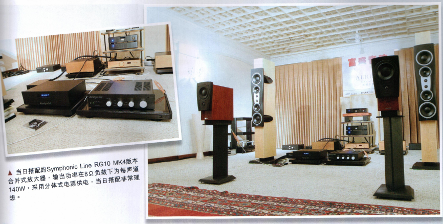 值得一提的是当日搭配的Symphonic Line RG10 MK4版本合并式放大器,输出功率在8Ω负载下为每声道140W。RG10 MK4具备MC/MM唱头放大功能(通过放大器后面的一个开关可以调整增益)以及前级输出,亦可通过购买同厂后级设置bi-amp来升级系统。机器当中的前级部分由300VA变压器供电,后级部分则由单独的450VA外置变压器提供,外置电源由镍铁合金(MU金属)外壳包裹,屏蔽力极好。而电源中的电容总容量为10万4千μF(两个声道),唯一的缺点是这种电源结构,实际使用中需要三个电源连接,外置电源与放大器之间需要两个连接至后级部分。然而,Symphonic Line已提供与RG 10 MK4主机连接的优质电缆,因此,不必担心额外的费用。功率放大器输出级采用了AB类设计,每声道使用了两对半导体二极功率管,Symphonic Line选择的是东芝2SC5200/2SA1943的结合使用,使每个功率管可以处理高达15A的大电流。这台放大器提供了2对质量非常好的WBT喇叭端子,既可以接Y插也可以接香蕉插头。让用户使用更加方便。在使用过程中,机器内部表面温度很低,同时放大器可以通过遥控进行控制。