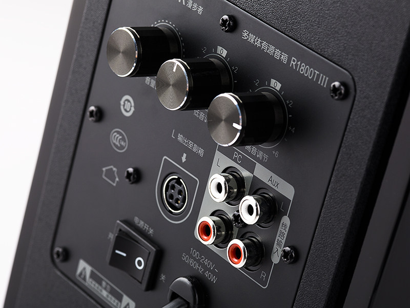 调节旋钮的下方布局紧凑、整齐,PC、AUX双路立体声音频输入,方便接换不同音源设备。线路输入端口下方的“100V-240V”数字标示,即全球宽幅电压技术。应用了这项技术的R1800TIII工作稳定性大大提高,完美解决了电压不稳定地区用户的后顾之忧。