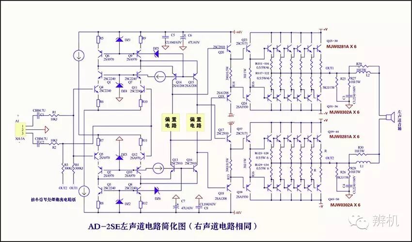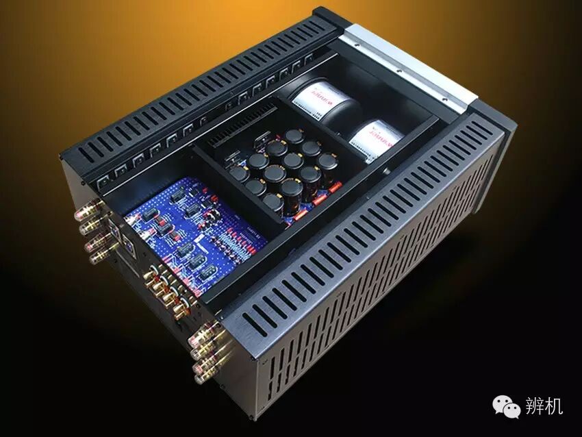 该机的输入部分为完全对称的对管组成镜像差分平衡放大电路;主电压放大电路采用共基极菱形差动放大电路,俗称X型差分放大电路。这种电路在HI-FI界的美誉度极高,它的优点是动态大、驱动力强、转换速率高、谐波失真小、低噪音、瞬态响应好、线性度高、频率特性好;输出级采用差分BTL功率输出电路,这种输出电路的驱动力十分强劲,动态凌厉。它将主电压放大电路产生的正负对称信号进行充分扩流,从而形成差分BTL输出。每声道用了12对摩托罗拉大功率管(整机共用了48只)并联输出!