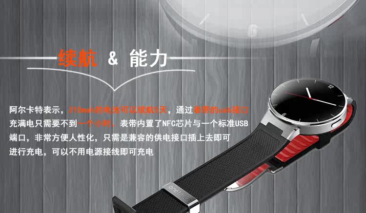 阿尔卡特OneTouch Watch的外形采用圆形表盘,看起来更加接近普通的机械腕表,表盘材质为金属,侧面有一枚实体按键用来唤醒屏幕,除此之外,由于OneTouch Watch内置有加速度传感器,因此用户只要抬起手腕屏幕也能自动点亮,十分便捷。OneTouch Watch的表带采用的是折扣式设计,表带内藏有一个USB接口,可以与电脑连接。由于机身比较小巧,因此它的电池容量仅有210毫安,不过阿尔卡特承诺它的续航可达5天,充满电也只要1小时。机身支持IP67级别三防,通过蓝牙4.0与智能手机连接。
