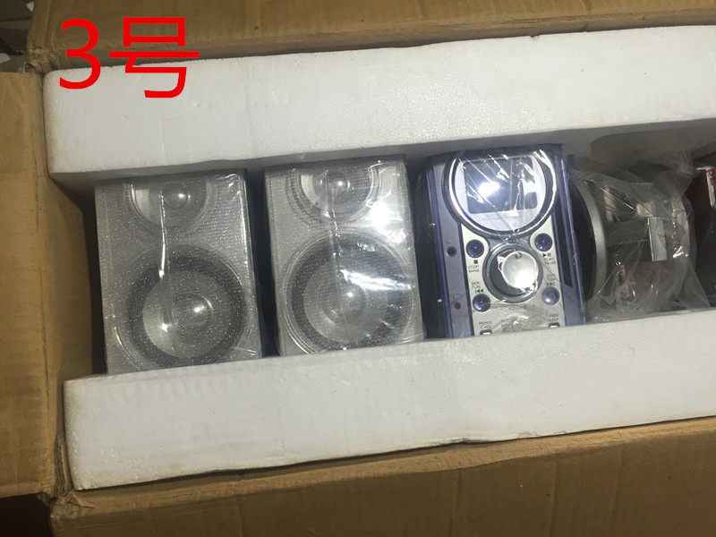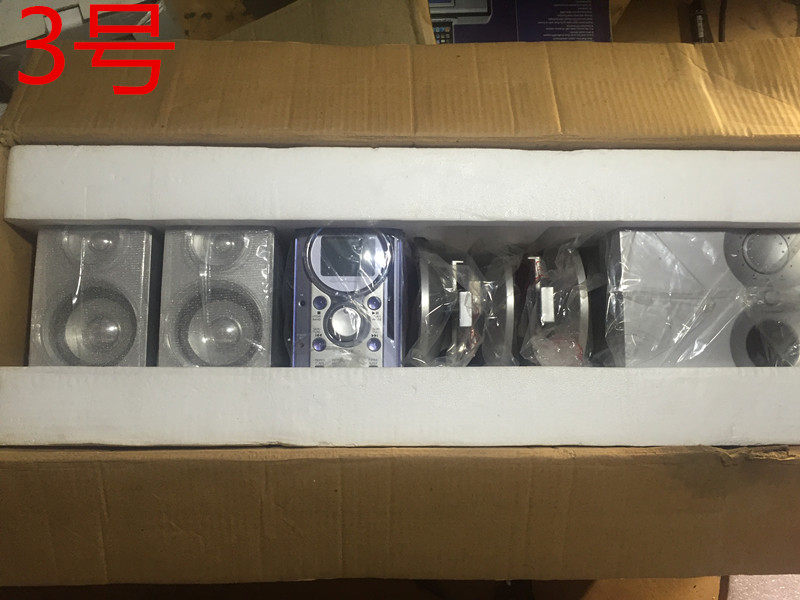 3号:HCT品牌,110V,美国销售的,功放带低音炮,CD,卫星箱四件套,卫星箱都全频加高音喇叭,带收音机,遥控,AUX,耳机接口,整套限广东省内玩家拍,个别螺丝生锈,一个CD机坏了,总共2套,99元一套包邮,回去用变压器或者换变压器就是完美的,限省内限高手!主机15*22*5功放18*25*19卫星箱9*25*19