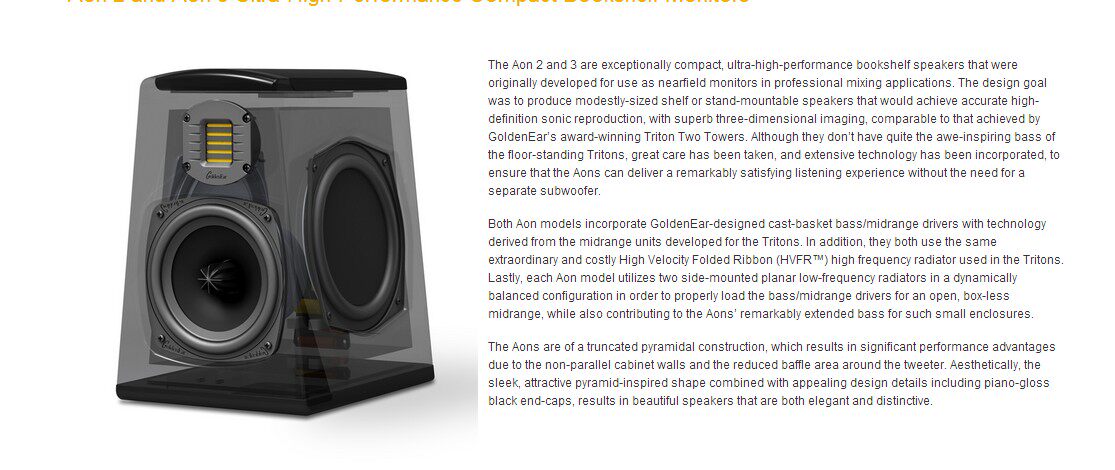 手头的这对Aon 3书架喇叭,就是GoldenEar的产品,是它的两款书架喇叭里较大的一款(另有更小的Aon 2)。