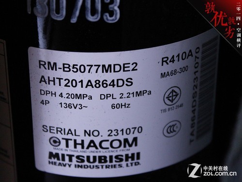 三菱和泰国THACOM合资品牌压缩机 三 菱重工SRCMB35HVBG采用了三菱和泰国THACOM合资品牌压缩机,型号为三菱AHT201A864DS(RMB5077MDE2),制冷量为 3500瓦,采用R410A制冷剂。压缩机铭牌上的“4P 136 V3~ 60Hz”规格参数的解释是:压缩机级数4级,额定电压136V,三相电,额 定频率60Hz。