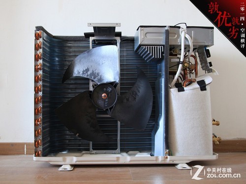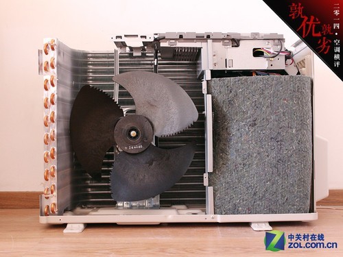格力KFR-35GW/(35583)FNAa-A3 格力KFR-35GW/(35583)FNAa-A3压缩机被紧密的包裹,包裹材料与三菱重工比较一致,只是在夹层中增加了橡胶材质,整体表现优于三菱重工。扇叶部分,采用三扇叶设计,造型更加夸张,同时叶片表面增加了凸点以降低运行噪音。