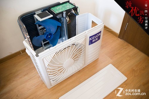 科龙KFR-35GW/EFVMS3a空调 科 龙KFR-35GW/EFVMS3a空调室外机由镀锌自攻螺丝固定,风扇采用了三扇叶设计,扇叶采用镰刀状特殊形状处理,。空调采用双排冷凝器,采用亲水 锡箔材料,在开启“清洁”模式后,空调会通过冷凝水对散热翅片进行清洁,以提高散热片的热交换效率。海信、科龙两款产品在室外机内部结构上基本一致,如果 不是两款产品的品牌logo、扇叶形状有所区别外,没有其他差别。