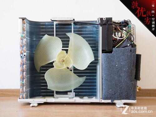 格兰仕空调采用了自产风扇 拆开空调外机,我们可以看到格兰仕空调采用了自产风扇,塑封设计,通过了IPX4防水测试以及国家3C认证。