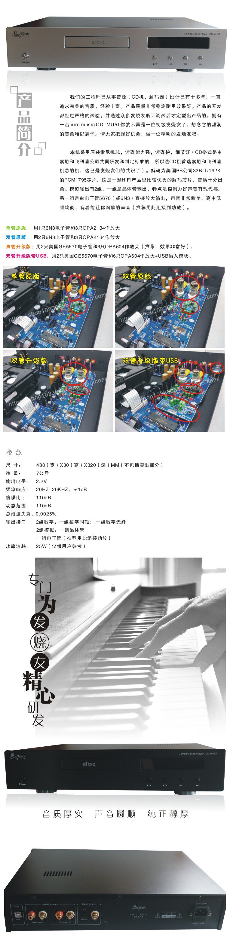 [碟机/播放器] 纯音CD-MU5T专业发烧胆CD机 CD播放机 HIFI胆CD机 带USB解码器 |