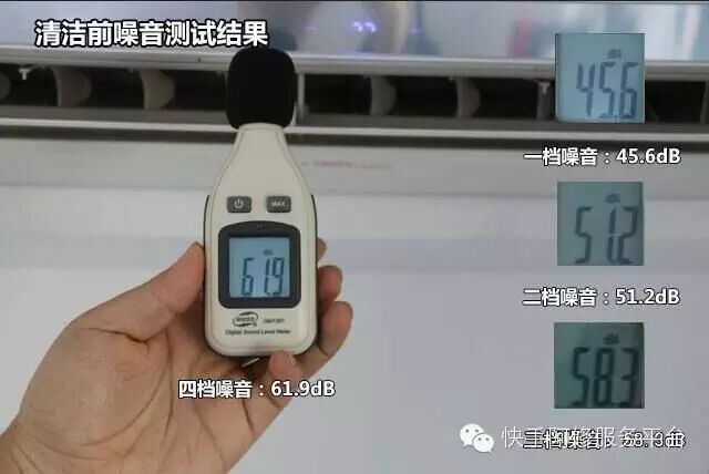 2 清洁前后噪音PK每个人都无法忍受空调开启后嗡嗡的噪音,尤其是在安静的夜里,空调的噪音更是让人相当痛苦!长期使用的空调内部积攒的灰尘等都会导致运行噪音的飙升。在清洁过程中,阿修也对空调的噪音进行了记录。 清洗前后噪音测试对比表 由上面两张对比图我们可以看到,经过清洁,空调的运行噪音有了明显下降。以最高档噪音为例,清洁之前4档噪音为61.9dB,清洁后下降为59.6dB,其它各档位噪音也均有下降,清洁的效果还是相当明显的。