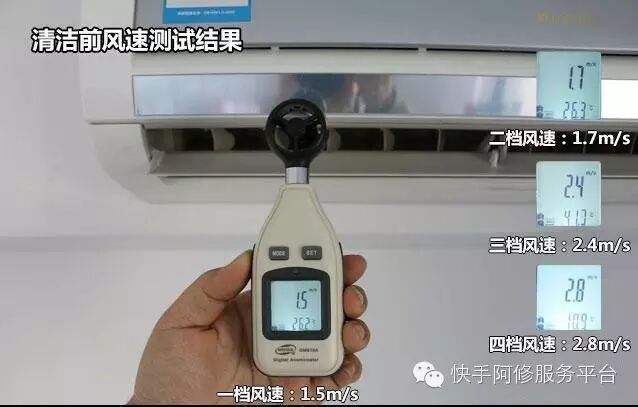 这次咱们来说说空调清洗前后风俗、噪音、功耗的对比。当然,口说无凭,下面就让我们用数据说话,看看空调清洁前后差别到底有多大! 1 清洁前后风速PK 作为空气调节器,最重要的指标当然是风速,阿修测试的第一项也是这台空调在清洁前后的风速。这台空调分为4档,我们分别测试了各档位下的风速并记录如下: 清洗前后风速测试对比表 空调档位 | | | 一档 | 1.5 | 2.0 | 二挡 | 1.7 | 2.3 | 三挡 | 2.4 | 2.7 | 四档 | 2.8 | 3.5 |