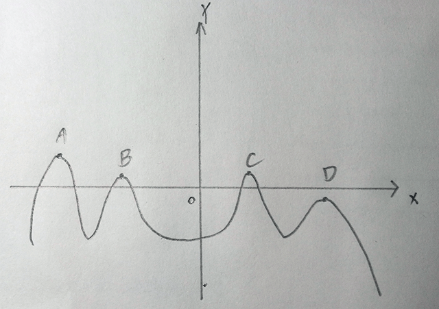 如果技术措施对音质的影响不是线性的,而是很复杂的曲线,那问题就来了。怎样把控和计算这些音质的最佳峰值点呢?简单地说,假设一个二维平面坐标系统,水平坐标轴的零点右边是正向的技术措施,左边是反向技术措施,并且这个技术措施越是远离零点,表示技术措施采取得越极端。比如类似上面的曲线,A点和D点都可以取得局部极值,代表你采取正反技术措施的两种设计在这个两个点附近都可以取得较好的音质,所谓的校音技术,也不过是些调整技术措施的微调,称不上大的设计理论。校音调整得好,可以找到局部音质最佳点,不好的话,有可能效果不佳,比如你只是在一个斜率较小的峰值附近,你的技术措施的调整并不能够换来足够明显的效果。