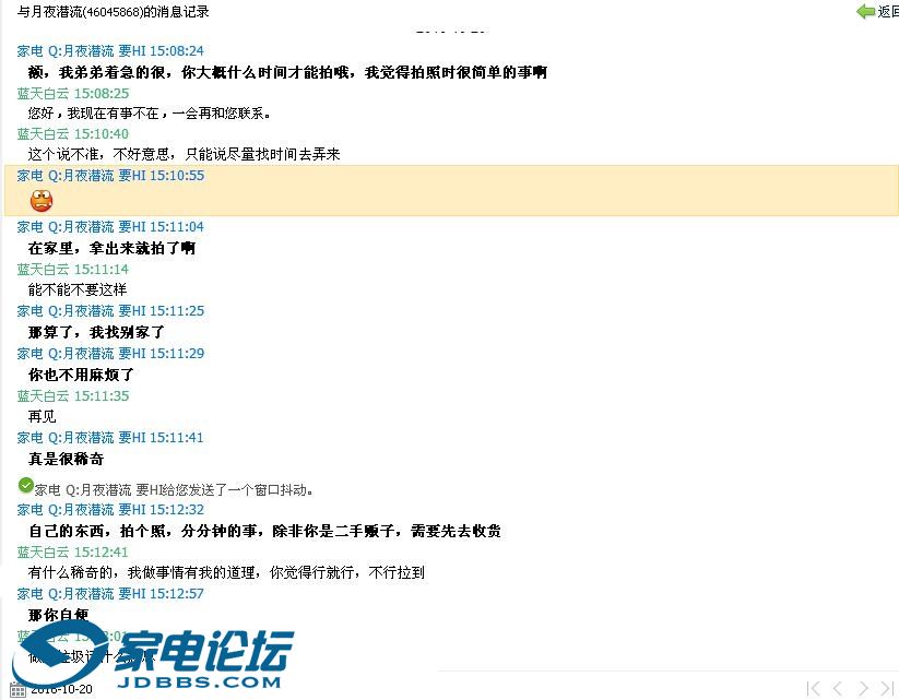这个“白云蓝天HI”自己跑进我的帖子,说他有,我说那就可以加微信,拍照聊聊价格,然后他说他不上微信,只有QQ,(这里我没什么歧视的意思,不过现在不用微信,真是少之又少,也有可能是不想被别人发现什么),接着这一段让我无语的经历就开始了。