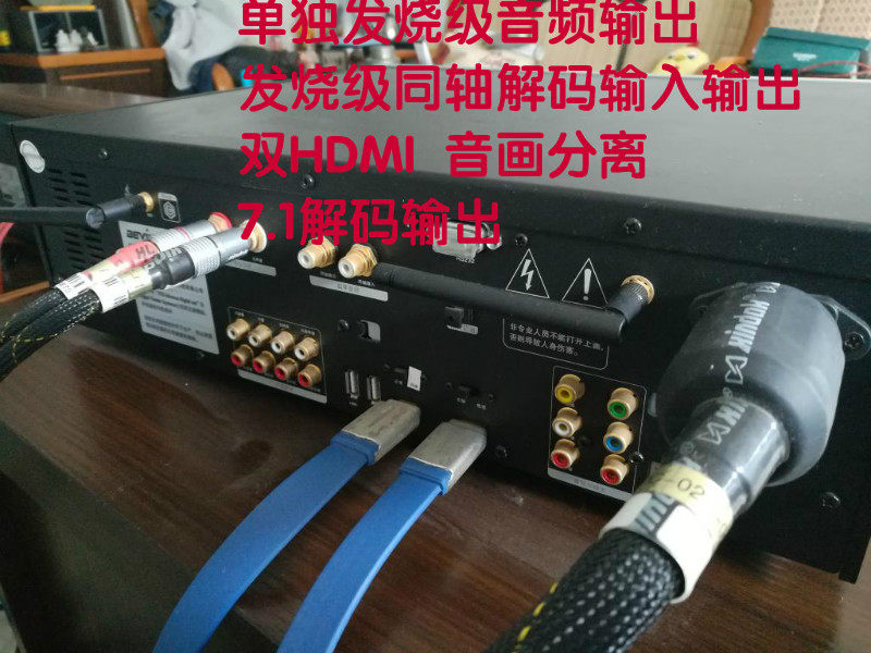 烧友一手自用发烧级BV906M高清播放器 至尊版 市场价9980元 当时购买价格7000元迈威尔3010 芯片 带光驱几乎没有用 带发烧级音频解码 带同轴输入输出解码 带HDMI 音画双输出 机器正常使用无修无磨 机器没有拆过 价格5800元 诚意要可以小刀 电话13159247189 QQ;649120228  V906M 音视融合 鲜明悦耳架设智能影音大屏用户定制Hi-Fi级播放系统 ·双芯片强强结合,完美实现192KHz/24Bit DAC功能 数字接收介面选用英国Wolfson(欧胜)公司的顶级芯片WM8805,内置有先进的,带抖动衰减锁相环和时钟再生功能,可以使时钟周期抖动小于50ps RMS,大幅提升数字信号质量; CS4398拥有一个完善的立体声24位/192千赫数字至模拟(D/A)转换系统; 使用单片机软件控制技术,实现WM8805 DIR芯片和CS4398 DA芯片的和谐配合,全自动识别44.1K--192K任意频率的SPDIF信号; ·采用专门定制的全屏蔽变压器为数字和模拟电路独立供电,保证音频信号的纯和静 ·搭载碧维视影柜系统,海报墙式呈现本地影音资源,pad端也能轻松操控,实现便捷高清生活 Ø 碧维视影柜系统特有的海报墙界面,清晰明了展现本地影音资源,告别传统文件浏览模式,详细分组方便用户找到心仪的影片资源,海报+内容简介让本地影音资源鲜活生动,高清即刻便捷享。 Ø 影柜也可掌中操控,用户可以在PAD或智能手机端安装影柜APP,掌上设备也能看到海报墙。输入影片名,影片信息秒速展现。 ·拥有支持4×4T大容量硬盘仓,让收藏梦不再被空间局限。 使用支持五万次无损插拔专利技术的内置硬盘槽,最大兼容4×4T,更大空间添加更多收藏。 ·采用Marvell88DE3010芯片,支持1080P全高清,真高清3D画面助您畅享高清生活。 Marvell88DE3010芯片,为3D画面提供强劲动力,独有的Qdeo™技术,安静无噪画面因此而生。 ·专业级内置电源,稳定供电,安全可靠。全面提升影音表现,延长硬盘使用寿命。 ·搭载标准RS232接口,高清智慧享。 BV908M搭载有标准RS232接口,用于与智能家居或智能中控系统相连接,实现影院智能化。 ·支持模拟7.1声道、次世代源码输出,配备光纤/同轴接口。齐全接口,满足烧友日常所需。 ·搭载蓝牙接收模块,支持将手机、pad等有蓝牙输出功能的设备的音频连接到BV906M,实现播放图片 图片