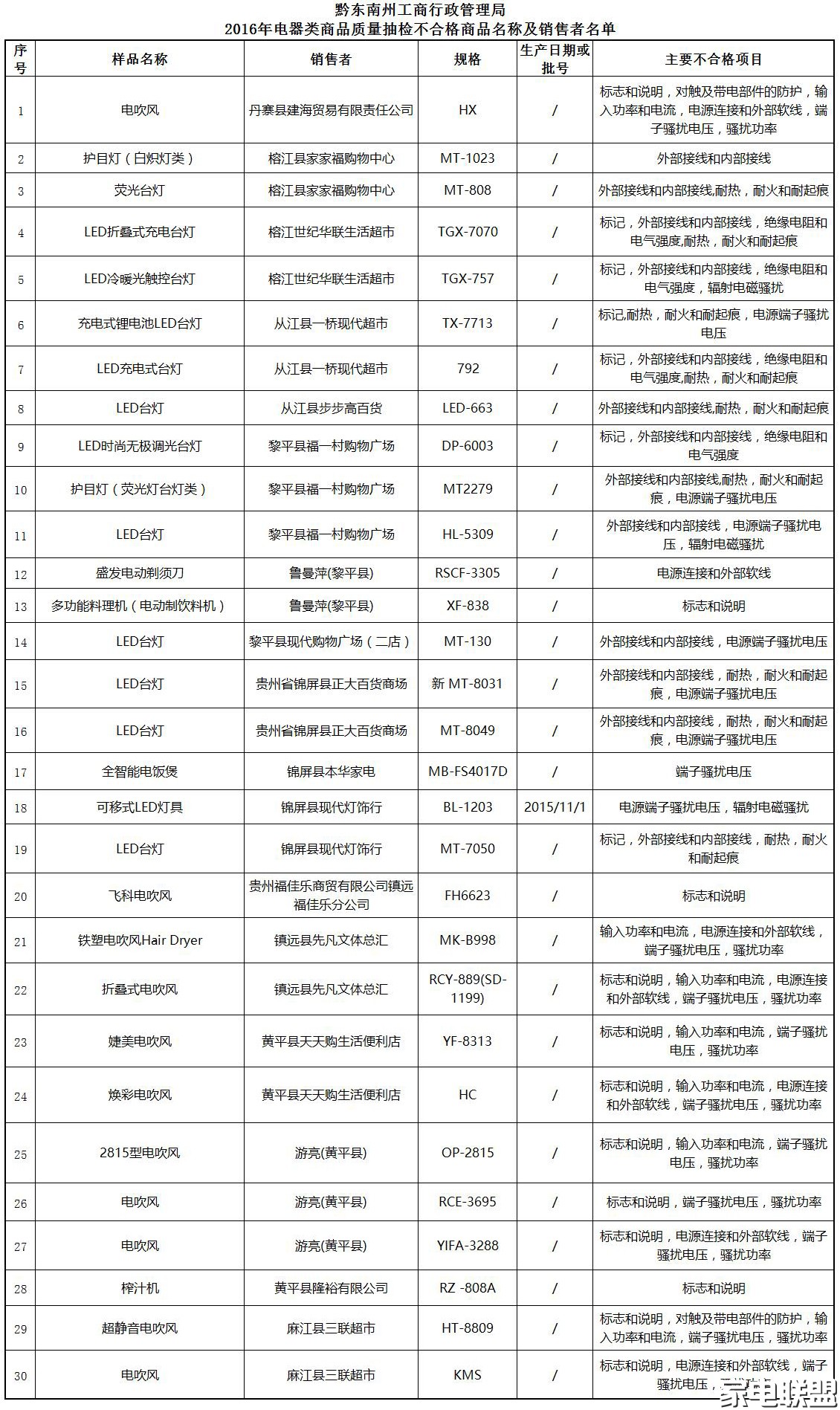近日,黔东南州工商局在其官网上发布了关于“流通领域商品质量抽查检验公告(2016年第05号—电器类)”,这次主要是对流通领域电压力锅、电吹风机、电动剃须刀、儿童台灯、榨汁机等电器类产品质量进行了定向抽查检验。