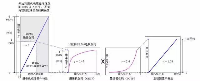 SDR高清摄像机拍摄信号E的电平范围可以达到0-600%,但BT.709电视伽玛只对峰值白对应的100%电平以内的信号进行非线性伽玛处理,超过100%电平的高亮度信号无法再现,系统能够再现的动态范围为100%,100%传输电平对应的监视器峰值亮度为100尼特。