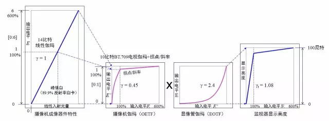 BT.709电视伽玛只定义了黑至峰值白对应的0-100%电平,在实际的摄像机产品中,电视伽玛处理的这部分信号大约占传输电平的90%,100% - 600%的高亮度电平则用拐点/斜率压缩到剩余的10%电平资源内,系统能够再现的动态范围为600%,即动态范围是正常曝光量的6倍。由于代表100% - 600%高亮度的电平信号只能使用传输电平资源的10%,图像中高亮度部分的层次被压缩,无法完美再现。