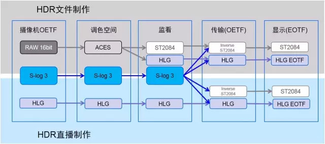 目前市场上大多数摄像机不能记录PQ或HLG文件,只能记录S-Log3或类似的对数伽玛文件,这些摄像机拍摄的素材都可以用S-Log3制作HDR母版,播出时再转换成PQ或HLG。