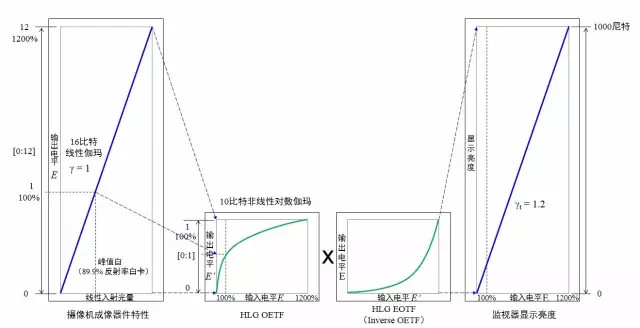 HLG非线性特性是为兼容SDR设计的,与硬件性能无关。支持HLG制作的摄像机拍摄信号E的电平范围为0-1200%,经过HLG非线性处理后信号E′的电平被压缩到0-100%,峰值白对应的100%电平占传输电平50%,100% - 1200%的高亮度电平占用其余的50%电平资源。HLG系统能够再现的动态范围为1200%,也可以说 HLG的动态范围是正常曝光量的12倍。