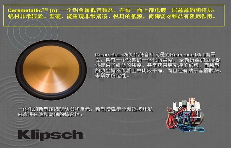 • 每一只Reference 系列的音箱都运用了专利号角技术,使之能产生身临其境的声音,低能耗高产出,高准确性,低失真率,宽广的音域以及清晰的声成像.
