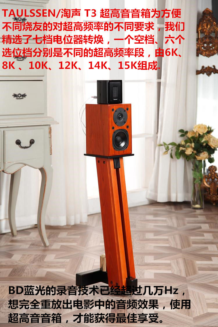TAULSSEN/淘声 T3 超高音音箱采用了惠威的超高音喇叭单元,音质清脆靓丽,音域宽阔,细节丰富,延展性好,立体感强,扩散号角声音定位感,声压均匀分布,对于增强补充音色比较暗淡,超高频延伸欠佳,表现力欠佳,量感不够的音箱,有着独特的作用,经试验,效果显著! TAULSSEN/淘声 T3 超高音音箱可搭配全频书架箱,二分频书架箱,落地箱,影院前置环绕箱使用,不是只有纯HIFI音响播放音乐才能玩超高音,即使是用家庭影院看带环绕效果的DVD或BD蓝光机电影也需要超高音。因为现在很多DVD或BD蓝光的录音技术已经超过几万Hz,想完全重放出电影中的音频效果,使用超高音音箱,才能获得最佳享受。 TAULSSEN/淘声 T3 超高音音箱在结构上是选用了10毫米高密度箱体,半圆弧切边,采用精湛的PU工艺,极其精致,接线柱、旋钮全面升级,24K镀金的接线柱,嵌入式手动电位器旋钮,内六角自攻螺丝,用料十足,搭配出色,另超高音音箱更上档次 TAULSSEN/淘声 T3 超高音音箱是否能加在影院前置声道或后置声道或中置声道,就是烧友常说的前三,通常很少有人会这样玩,不过,理论上在侧置或后置声道加超高音是最好的,因为它们是出现残音的地方,在模拟环绕声效果时,营造的基本上都是残音、尾声,这些都是超高音能够胜任的地方,如果加了超高音,空间感会变大,残响会很丰富,真实程度会更逼真