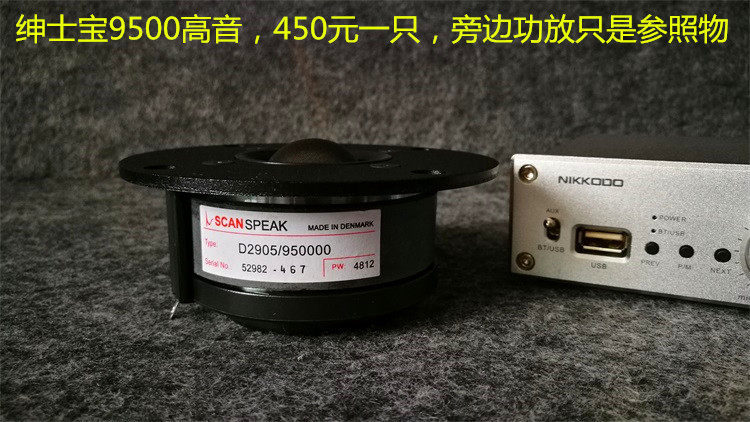 TAULSSEN/淘声 T3 超高音音箱为方便不同烧友的对超高频率的不同要求,我们精选了七档电位器转焕,一个空档、六个选位档分别是不同的超高频率段,由6K、8K 、10K、12K、14K、15K组成,顺时针依次提高频率,大家都知道,正常情况下,分频良好的超高音不会显得很大声, 即使是108dB的灵敏度,因为很多人是的听觉极限是16KHZ, 但是确实能感受到声压,所以我们精选到15K为止 TAULSSEN/淘声 T3 超高音音箱在摆放时可放在搭配主箱的顶部,也有人摆在主音箱的旁边,越近越好。为什么要这样摆,主要是想达到发声点在一个音源发出的“单点音元”效果。此外,由于超高音扬声器的发声比较快,为了与中音、低音信号同期到达你的耳朵,除摆放时应放在中高音扬声器顶上同一直线外,还要将超高音单元的位置挪后少许,就像田径比赛的400米短跑,运动员的起跑点不同,但跑到某个位置就能同步到达 另有少量原装正品绅士宝9500高音单元机会难得!! 一只价格 丹麦原产SCAN-SPEAK(绅士宝) D2905/950000 经典丝膜 高音喇叭 特别提示:喇叭收到确认前请不要上锡和上螺丝,否则有什么问题无法退换,一旦上锡和上螺丝,视同使用过,无法更换或退换等,请用3.3uf电容测试。SCANSPEAK 绅士宝自1970年在丹麦创立以来,一直坚持专注于研发在同级别产品中具有更好性能的扬声器单元。SCANSPEAK绅士宝扬声器单元性能优异,不但具有超凡出众的音色还原度和艺术般的表现力,而且具有非常好的平顺性和体贴的温暖感,音乐的感情自然流露,整体的解析力和背景的灵静度非常高,中频的厚润度还原真实 , 总体来说声音沉稳耐听,有一种引人入胜的音乐魅力,是个非常出色的扬声器品牌。SCANSPEAK绅士宝扬声器单元上市以来,得到了全球众多HI-END顶级音箱厂商的认可并广为采用,英国的ProAc贵族、意大利的Sonus faber世霸、荷兰的Crystal晶彩、丹麦的THE GRYPHON贵丰和GamuT嘉密、美国的WILSON AUDIO威信和KRELL奇力等,这些大名鼎鼎的世界高级家用音响著名厂牌,旗下定位为中高端以上型号的器材都使用了SCANSPEAK绅士宝为其定制的扬声器单元。SCANSPEAK绅士宝从著名的8513高音单元开始,就已确立自己的音色标准并一直保持至今。以超高解析、中性无染、平顺连贯、无压耐听的声音再现为持久追求,成为SCANSPEAK绅士宝扬声器单元的显著特点。真实再现,就是SCANSPEAK绅士宝所一直坚持的理念。动感、激情与和谐,就是SCANSPEAK绅士宝所奉行的音响哲学。