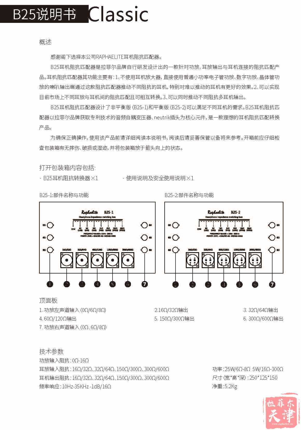 现在拉菲尔为了满足耳机烧友的需求,特开发了一款耳机阻抗匹配器,型号B25。此匹配器应用自己研发并生产的自耦式的变压器(此变压器可实现不同绕组间的转换,实现精准匹配),有多组阻抗的输入和输出,能同时满足功放、耳放、电子管前级、手机等不同阻抗形式的输入和市面绝