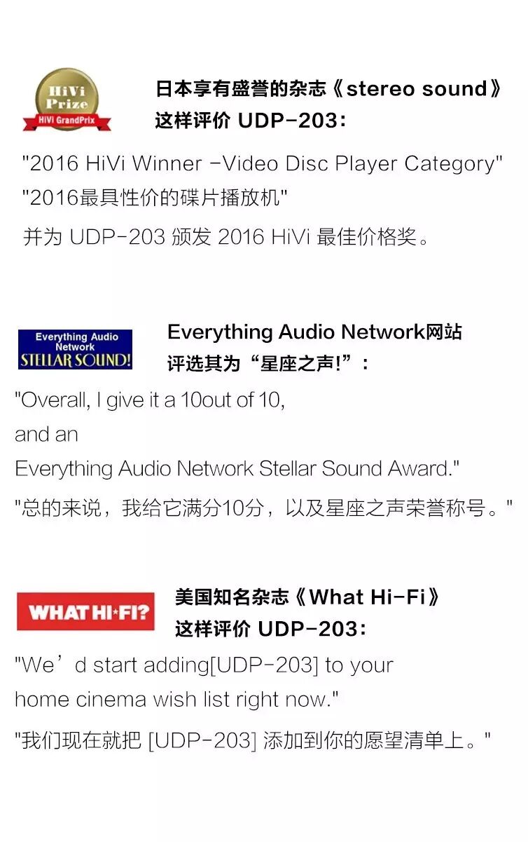 在日本、在俄罗斯、在美国,只要 OPPO UDP-203 发售的地方,测评人士、影音网站、发烧友论坛都将 OPPO UDP-203 视为 4K UHD 蓝光播放器的成功典范。