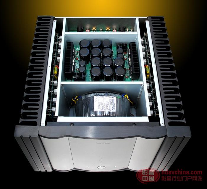 输入到第二级,热端这时有由Q14和Q15(冷端由Q18和Q19)组成的差分电压放大电路。本机的主要增益来自于电流输出级,采用五级达林顿的差分BTL(桥接)功率输出电路,驱动力十分强劲,动态凌厉,大大提高了功放的阻尼系数,对于展现宏大音场,进一步提高声压、精确定位声音的位置和提高对喇叭的控制力功使其收发自如功不可没,而且减小了对电压放大级的影响,对进一步提高电压放大级的线性起到非常重要的作用。打开该功放的铝合金顶盖,可见该功放采用了独立屏蔽的三抽屉抗干扰结构,腔体设计属于发烧大手笔,可极大减少左右声道及强电对弱电部分的电磁影响,有利于进一步提高声道分离度。机器后面稳驻箱格的是1200W的高品质环牛,笔者在该机通电时特别将耳朵贴离变压器约2cm的位置,这么巨大的功率,并未听到任何异响,证实该变压器的确封装性能优异。机器中上部的格内是由16只总容量高达18万微法的ToneWinner音频专用订制版优质电解电容组成的滤波大水塘,这是天逸为整合品牌优势专门在名牌电容生产厂家贴牌批量订制的,实测指标超越时下许多大名鼎鼎的发烧级电解,可轻易征服众多大食量的高保真音箱。