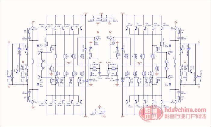 AD-1PA的电路设计,采用了音响界最为推崇的全平衡传输及放大方式:全对称、全平衡、差分输入到BTL(桥接)功率输出。由非平衡/平衡转换电路输入的热端信号分别由Q3/Q4/Q9/Q10/Q8/Q11/Q40(冷端由Q1/Q2/Q5/Q6/Q7/Q12/Q13)组成的共射基极(Cascode),与菱形电流镜像差动放大电路担纲小信号放大,该电路俗称钻石型差分镜像放大电路,其优点是动态大、驱动力强、转换速率高、谐波失真小、低噪音、瞬态响应好、线性度高、频率特性非常不错。共射基极电路的加入,可更好提高放大器的频带,尤其是提高高频时的线性度,使高频响应更好、延展更高,高频的音乐解析力更佳,声音更见细腻和油润透明。