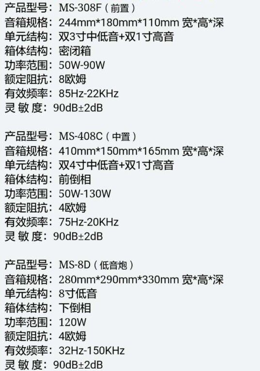 精准的影院HiFi性能, 重现真实声音的最高标准归功于MS-308在专业单位长达15年的研发精进,使MS-308设计能够对应最严苛的影院HiFi回放标准, 矩阵式单元结构能平衡单元运动所造成的位移, 修正非线性失真. 因此MS-308能比传统音箱以更轻松的方式来播放信息量复杂的音乐. 而面对大动态的古典音乐演奏, 现场演唱会录音与电影声轨更展现猛力士专业领域技术与传统民用音箱的不同之处, 随着音压的提高, 动态的扩大, MS-308提供源源不绝的解析力, 饱满细致的音乐感而无接近崩溃边缘的失真.超越立体声的3D结像力S-猛力士为专业录音室所研发的,这种分频器具备3D结像能力,这代表猛力士套装音箱能够在一个3D空间中提供更大范围的清晰结像,并且能让声音听起来更接近现场演唱的实际比例, 将立体声变成真正的3D结像. 这一项技术不但使得立体声有突破性的改进, 更在多声道当中展现无与伦比的实际空间感.矩阵式线性传输高音单元线性高音传输单元针对高音剧烈密集的震动所导致声音混浊, 与声音延迟作出最佳的解决方案. 在实际的音乐播放过程中永远保持最干净的直接音, 消除了单元背部复杂的气压干扰.