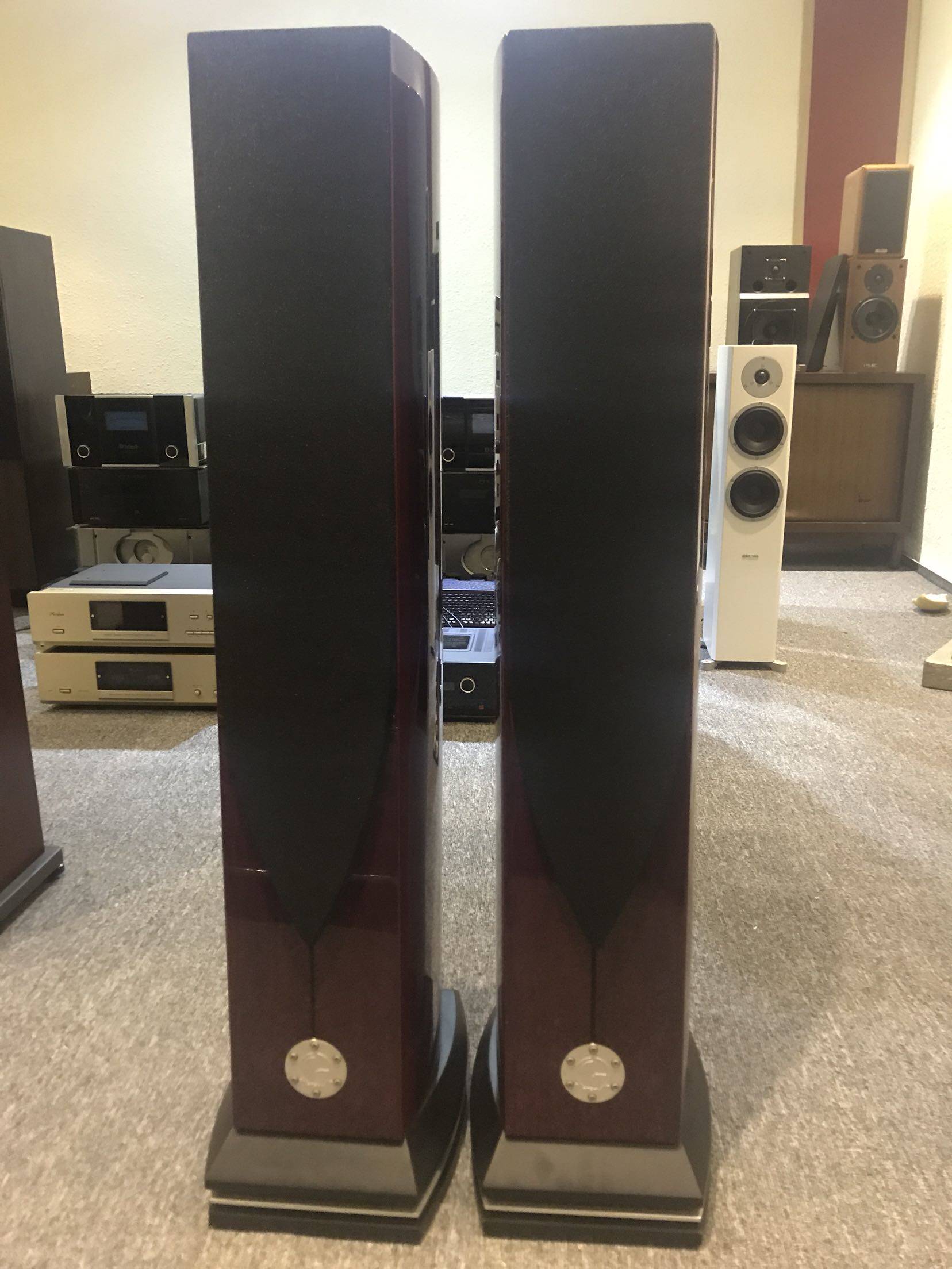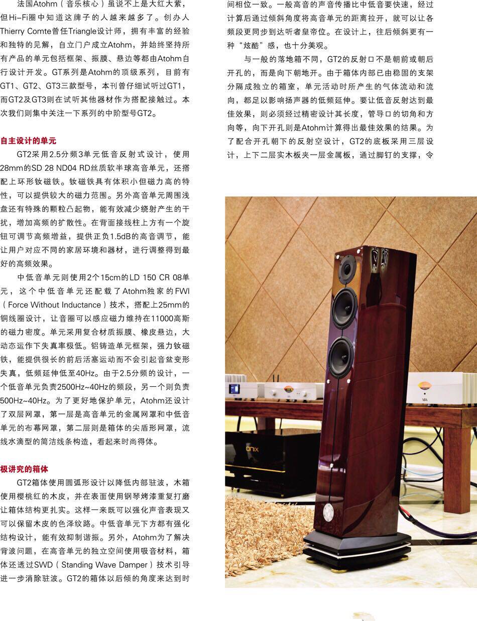 淘宝网:https://item.taobao.com/item.htm?id=560817925951原装法国ATOHM 音乐核心 GT2.0 尊贵红色钢琴烤漆限量版落地式 hifi 音箱,有意者尽快联系13415086012,林泳,一笔生意,一世朋友,价格可谈。全新摆样实体图片Atohm这样从单体的设计、开模与制作都自己来的品牌实在不多,更别说是连测试、量测、分音器设计、音箱结构、避震措施…等任何一个小地方也不假他人,即便是规模最大型的喇叭厂家也不过如此吧!就像是这款GT 2.0落地喇叭,处处可见设计者Thierry Comte的独到见解.GT 2.0是一款3单体2.5音路设计的小型落地喇叭,分音结构看似不复杂,但内部可是拥有Atohm很难一口气说完的各种技术.先从高音单体谈起.光是这颗编号为SD28 ND 04RD的高音单体便有5大重点,包括超高效率、T铁顶端的铜环、铝质音圈、振膜周围的ADP技术,以及振膜背後的导流.高音振膜为28mm丝质软半球振膜,口径降一般25mm稍大,搭配强力钕磁铁,可获得98dB超高效率,几可与号角匹敌,而且可以提升动态,同时降低失真.音圈使用铝质套筒,可兼具高硬度、轻质量,且良好的散热效果.线圈使用CCAW(copper clad aluminum wire)镀铜铝线,铝线较铜线轻,但传导比不上铜,因此在表面镀铜可提升传导.T铁顶端加上铜环的用意是为了降低电杆效应,可提高工作线性并降低失真.ADP(Anamorphic Dispersion Patterns)技术则是振膜周围的面板上布满一颗颗凸起的小点,可帮助声波扩散,让高音的扩散角度更广.至於振膜背波采用双重手法加以处理,一是振膜正後方有个锥形导流器,可将背波导引至後方,接着在磁铁後方的音室加入阻尼物,削减背波的干扰,Atohm表示此双重措施有利於频率向下的延伸.GT 2.0是一款3单体2.5音路设计的小型落地喇叭,结构看似不复杂,但内部可是拥有Atohm很难一口气说完的各种技术,多种调整功能更是兼顾了空间的适应性.2.5音路的GT 2.0中低音和低音使用同一颗低音单体,编号为LD150 CR 08,同样是由Thierry包办所有的设计,从振膜材质、悬边、弹波到磁铁总成,无一例外.LD150 CR 08单体的振膜采用合金制作,目的是让盆分裂的频率落在可听闻的范围之外,音圈套筒则使用Kapton/Nomex材料.最特殊的地方在於悬边,称之为LDS技术,其要诀就是悬边使用特殊的几何形状,可以减低振膜边缘扭曲的形状,使700Hz至1800Hz之间的频率延伸得更为平顺.此外还有FWI技术,原理与前述高音的铜环类似,让电感效应降到趋近於零以消除非线性失真.多音路喇叭有一个很重要的问题必须解决,那就是时间相位的一致性,这是因为高音与低音振膜的深浅不同,锁在同一面障板上时,音圈的位置也就会前後不一,而造成发声点不同,时间相位不一致.为此GT 2.0采用倾斜箱体设计,高音单体在後,低音单体在前,藉此让高、中、低音的音圈位在一条轴线上,达到时间同步的目的.单体说完,再来就是GT 2.0的音箱设计,依然处处充满机巧.GT 2.0采标准的低音反射式设计,只不过反射孔开口设在底座下方,原厂提供一个海绵塞,可以从底座网上塞入反射孔,藉以调整低频量感,像是摆放位置距离背墙或墙角较近时,低频量感会变得更多,此时就可以用上海绵塞,调整低频的量感.GT 2.0音箱内部还有一个特殊的SWD技术.所谓SWD是Standing Wave Damper的缩写,意味音箱内部驻波的控制.据Atohm表示,音箱的狭长形状,容易在两个端点形成驻波,落地喇叭就是音箱顶端与底部,而造成某些频段的轰鸣.SWD便在高音单体後方的空间,放置以阻尼材料制成的层状隔层,其效用就像是声学上的阻抗匹配变压器,或是滤波器,藉由导引背波与产生阻尼的作用,打消驻波.高音采用28mm丝质软半球振膜,口径较一般25mm稍大,搭配强力钕磁铁,可获得98dB超高效率.振膜周围的面板上布满一颗颗凸起的小点则是ADP技术,可帮助声波扩散,让高音的扩散角度更广.除此之外,GT 2.0还有一项特异功能,那就是音箱居然可以灌沙.灌沙的目的是让音箱变得更稳固,且可提供阻尼效果,来改变音箱的谐振情况,灌沙未必一定要做,而是使用者可以依自家空间与系统的状况施为,达到调音的目的.灌沙的开孔就在GT 2.0面板下方logo圆盖,开盖即可灌入最多3L的沙.GT 2.0还有一个相当特殊的底座,看起来比一般喇叭的底座厚上许多,原来里头也有玄机,此一技术称之为PDS(Progressive Damped Spiking),其功用是让音箱本体与底座之间的耦合达到最佳化.GT 2.0的底座看起来像是3层结构,但主要就是上、下2层,中间的银白色铝板是装饰功能居多.上层底座直接乘载音箱,即是音箱本身的底座,下层底座则接触地板.音箱底座透过4只尖端朝上的铝制主角锥放置在下层底座上,而4只主角锥的背後还有另一组角锥直接接触地面.藉由此一设计,震动被导引至上层底座,仅一部分震动传至地板.GT 2.0有一项特异功能就是音箱居然可以灌沙.只要打开面板下方的圆盖即可灌入最多3L的沙.灌沙的目的是让音箱变得更稳固,且可提供阻尼效果,来改变音箱的谐振情况,使用者可以依自家空间与系统的状况施为.接着看到防尘网罩,GT 2.0就连网罩都有的谈.GT 2.0具备2种网罩,可提供不同的形象质感.一种是传统大型网罩,外框为MDF,造型做得十分流线,像是倒过来的子弹型,用磁贴吸附於面板上.另一种是针对2颗低音单体做的圆形网罩,结构是金属网,如果你不想用大网罩,就只要在低音单体安装圆形网罩即可,它的高音振膜前方原本就有一层帮助扩散的金属网罩.但有趣的是,那2个圆型网罩不是只有保护与造型的功能,其实