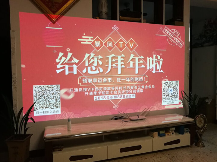 白天(朝向窗口)  在白天光线充足的情况下,上图3张分别为各个位置投射画面的实拍图、可以明显看到,不管是何种摆放位子,暴风AI无屏电视Max6的实投画面都足够出色,虽然背窗投射画面由于直线光照射的原因少许泛白,但是画面内容显示依旧能够轻松辨识,这与市面多数投影实投显示比较起来更为出色。