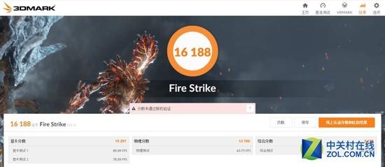 其次是在Fire Strike模式下,GTX 1080独立显卡在新3DMark的Fire Strike测试项中获得了高达16188的分数,其中显卡分数为19297,物理分数为13780。